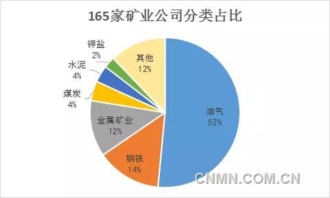 165家上榜的矿业公司,按油气、钢铁、煤炭、金属矿业、水泥、钾盐、其他几个行业对它们进行了分类,其中油气公司为85家,占52%;煤炭公司为7家,占4%;钢铁公司有24家,占15%;金属矿业公司有19家,占11%;水泥公司有6家,占4%;钾盐公司有4家,占2%;其他类公司有20家,占12%。
